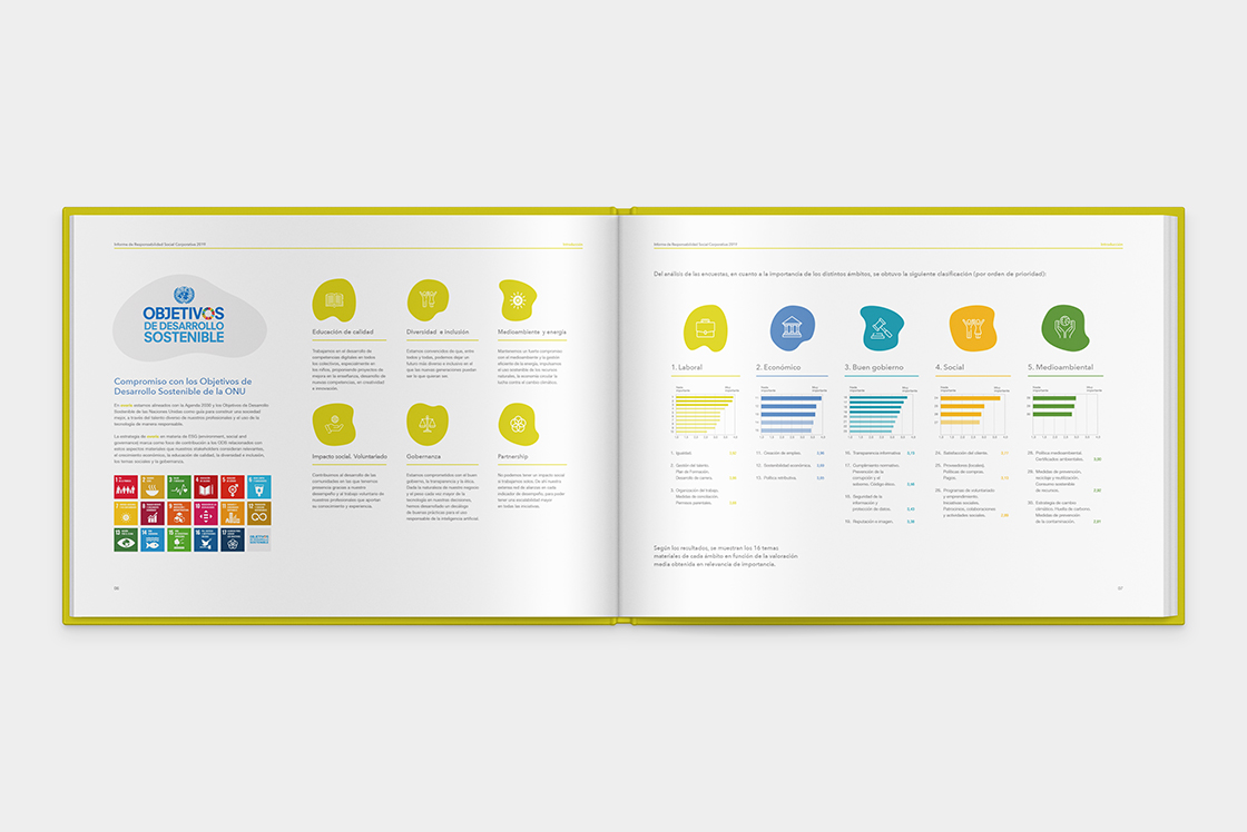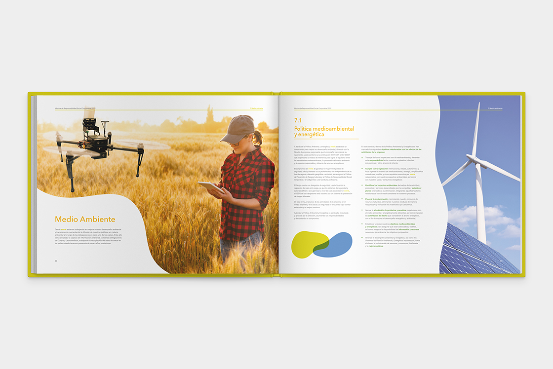 El objetivo de este proyecto fue presentar de forma atractiva y accesible la información sobre la gestión de la compañía en temas de sostenibilidad y responsabilidad social. Para lograrlo, realicé la maquetación de un documento de 180 páginas, en el que trabajé en la organización y presentación visual de la información, utilizando elementos gráficos que permitieran una lectura clara y amena.