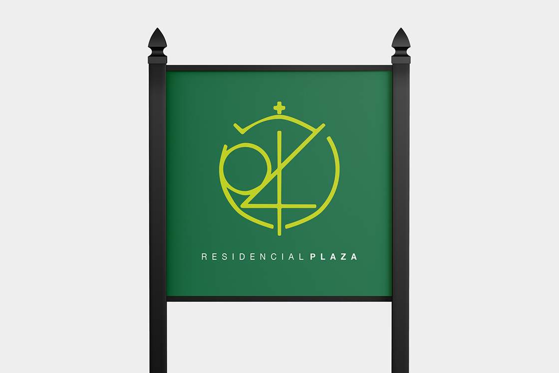 Una vez tuve claro el concepto que debía transmitir, comencé a trabajar en la creación de la identidad de marca. Quería que la identidad visual transmitiera lujo y exclusividad, pero también que tuviera un aspecto ligado a la tradición del pueblo. Creé un símbolo que recuerda a un sello de ganadería, formado por líneas geométricas propias de la arquitectura, en el que se pueden intuir las letras de la palabra «Plaza», nombre de este residencial.
