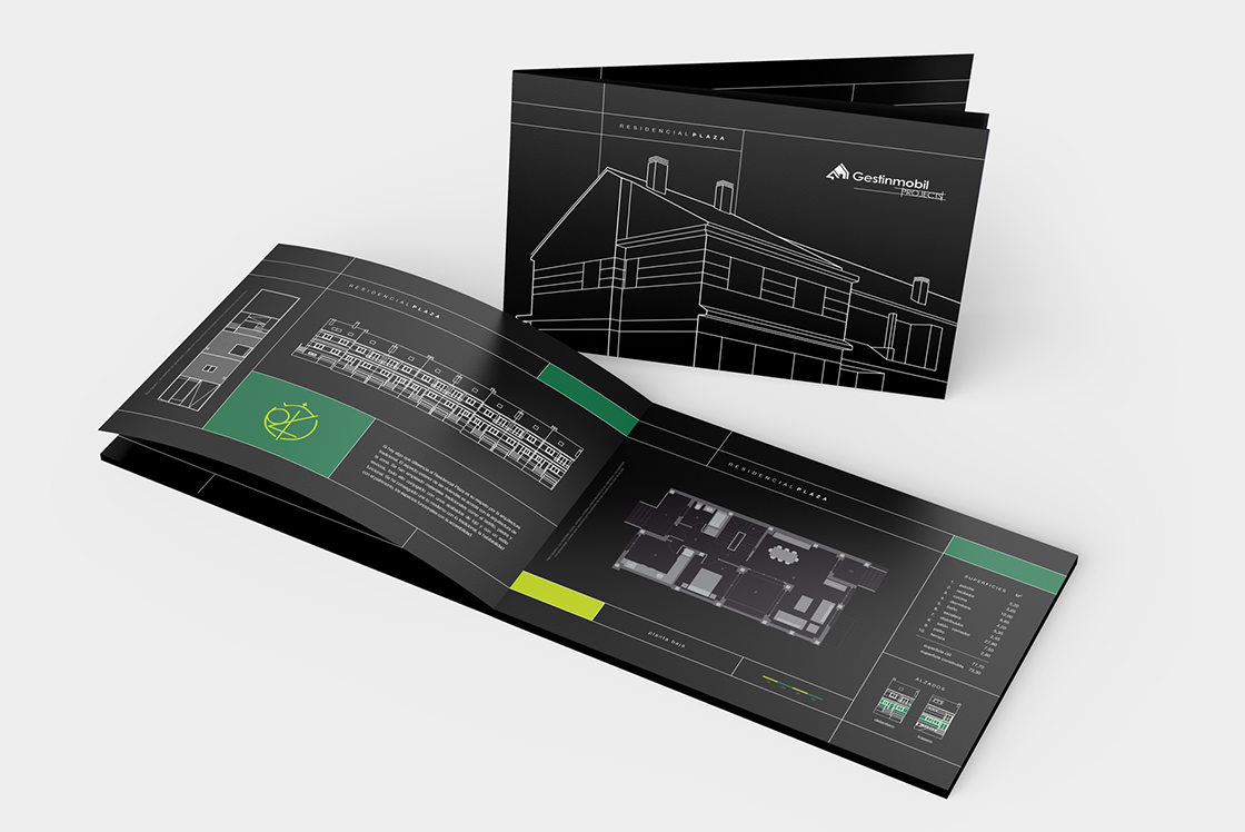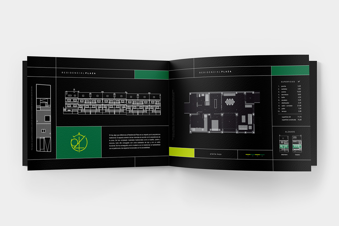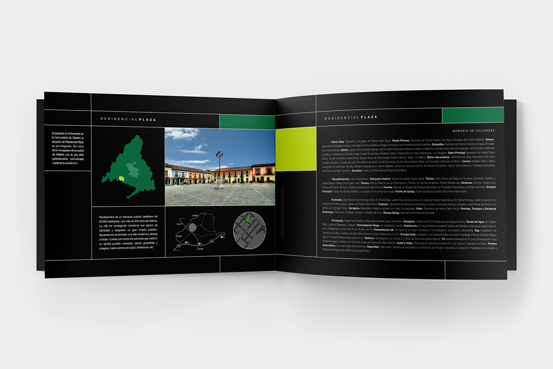 Residencial Plaza es un conjunto de viviendas situado en Navalcarnero, una localidad al suroeste de Madrid. El promotor del proyecto me solicitó varios materiales comerciales impresos que se pudieran entregar a los posibles compradores, y una identidad visual que reflejara la arquitectura de las viviendas, que combina acabados de lujo con materiales tradicionales.